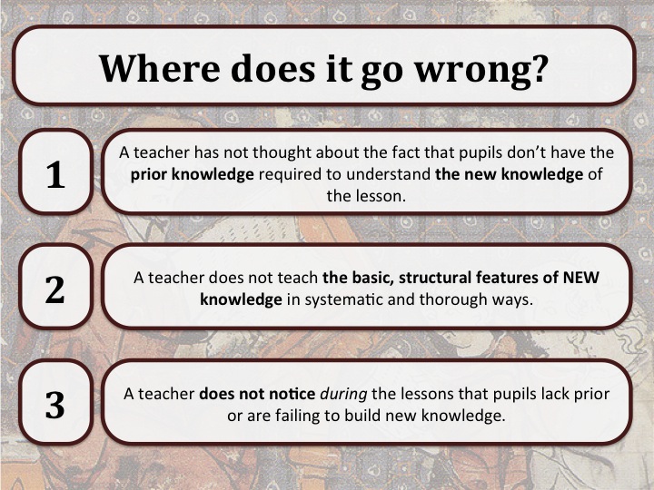 One other mentor and I were tasked with putting together a session on this issue. I have included three of my slides below. Often with mentoring one of the first tasks to do it to diagnose what kind of problem it is that trainees face. I offered on my first slide of the session three common but distinct ways in which trainees sometimes failed to think through the knowledge that pupils need.