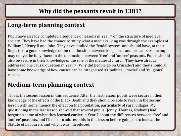 I then shared with mentors the lesson plan that trainees have to fill out: I used an example from the second lesson in a sequence answering the question ‘Why did the peasants revolt in 1381?’ As you’ll see in the ‘long-term’ and ‘medium-term’ planning boxes, this is fully focused on what knowledge pupils have, where their knowledge weaknesses are, and what needs to be done to address these.
