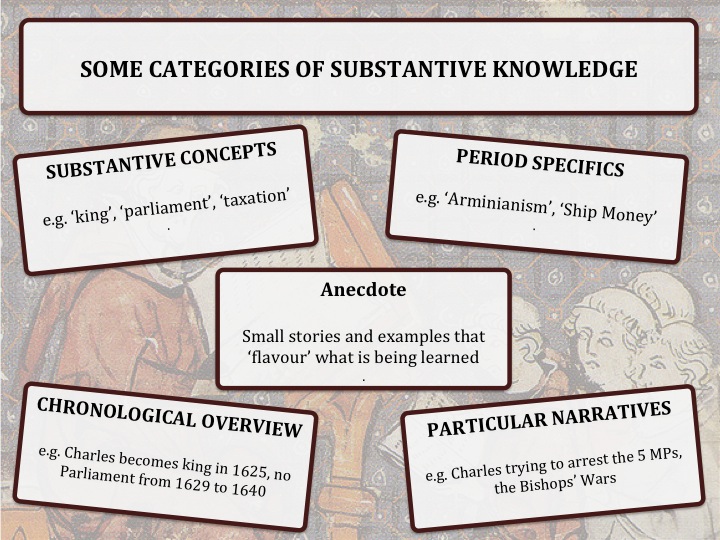 I gave the mentors a quick task here, and asked them to write down a list of the knowledge that pupils would need in order to answer the question ‘Why did the English Civil War break out in 1642?’ This, of course, is just the kind of activity that a mentor might do with a trainee. I then gave mentors some categories of substantive knowledge (they added ‘anecdote’ to my four). The idea here is that a mentor might use these categories with trainees: “okay, so you’ve planned for how your pupils will have a chronological overview of the period, but where are they going to build their knowledge about the substantive concept of ‘kingship’?