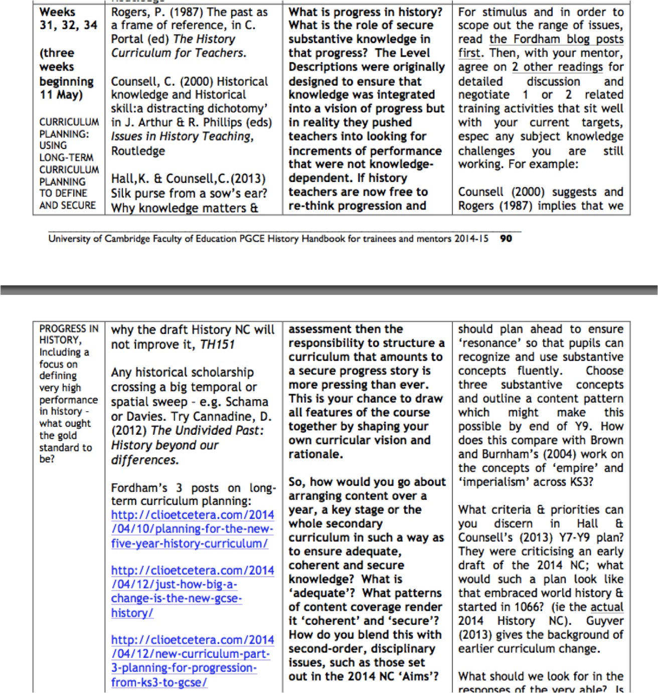 This is, in practice, how on the Cambridge History PGCE we have managed to cover so much in the time we have available. The role of building knowledge about the subject, about subject pedagogy and about child development is not left solely for the university to do. On our History PGCE, we see this as part of the responsibility of the mentors.