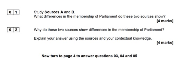 The expected answers are fairly simplistic, requiring that pupils note that there is a greater mix in Parliament in terms of gender and ethnicity. The mark scheme also suggests pupils mention class, though unless pupils know the background of the particular MPs depicted in Source B, strictly speaking they cannot comment on whether the social class has changed.